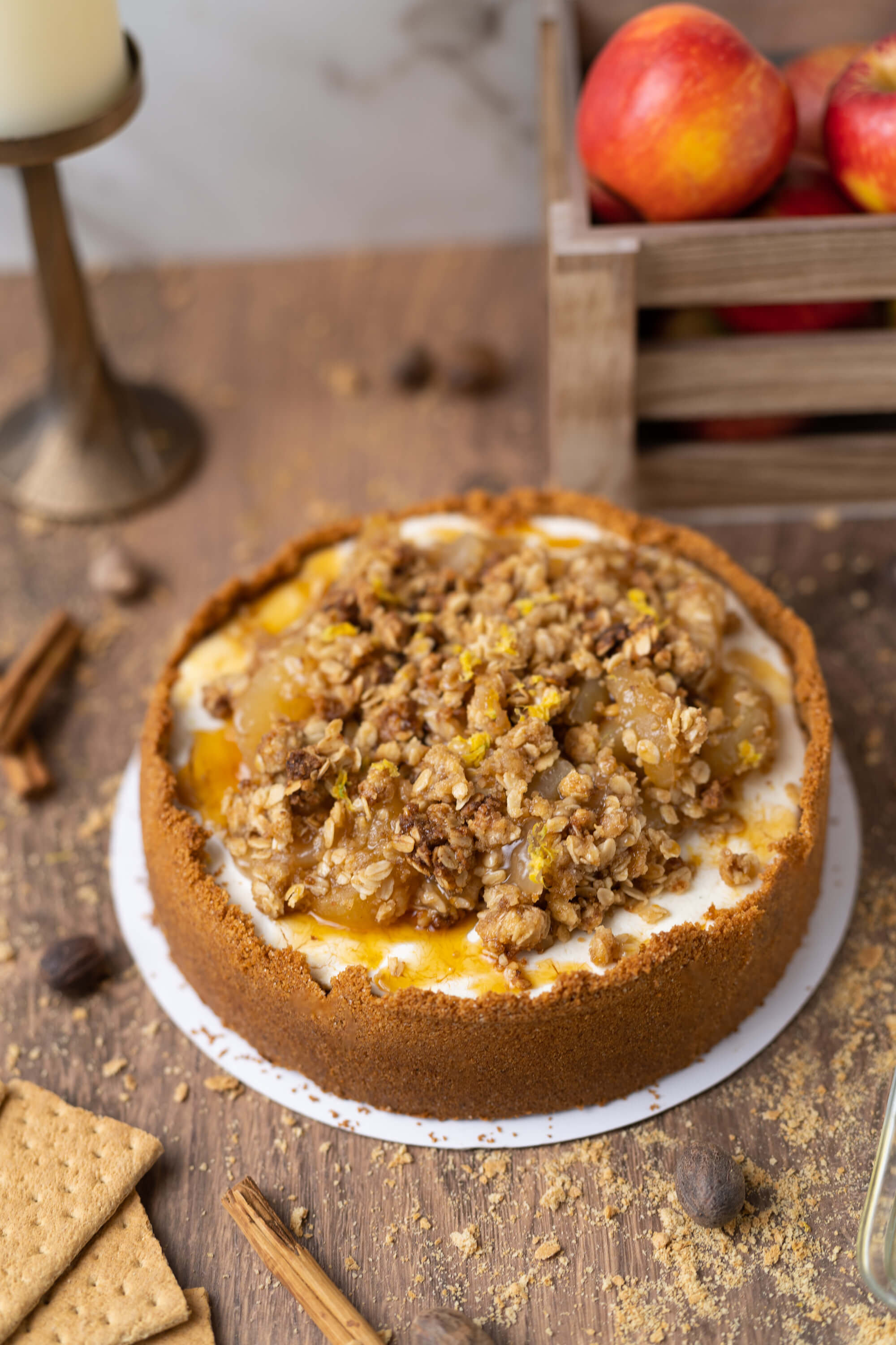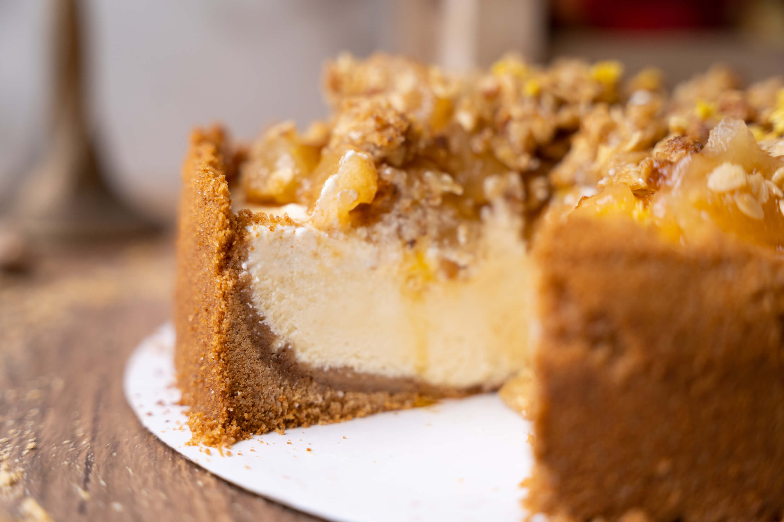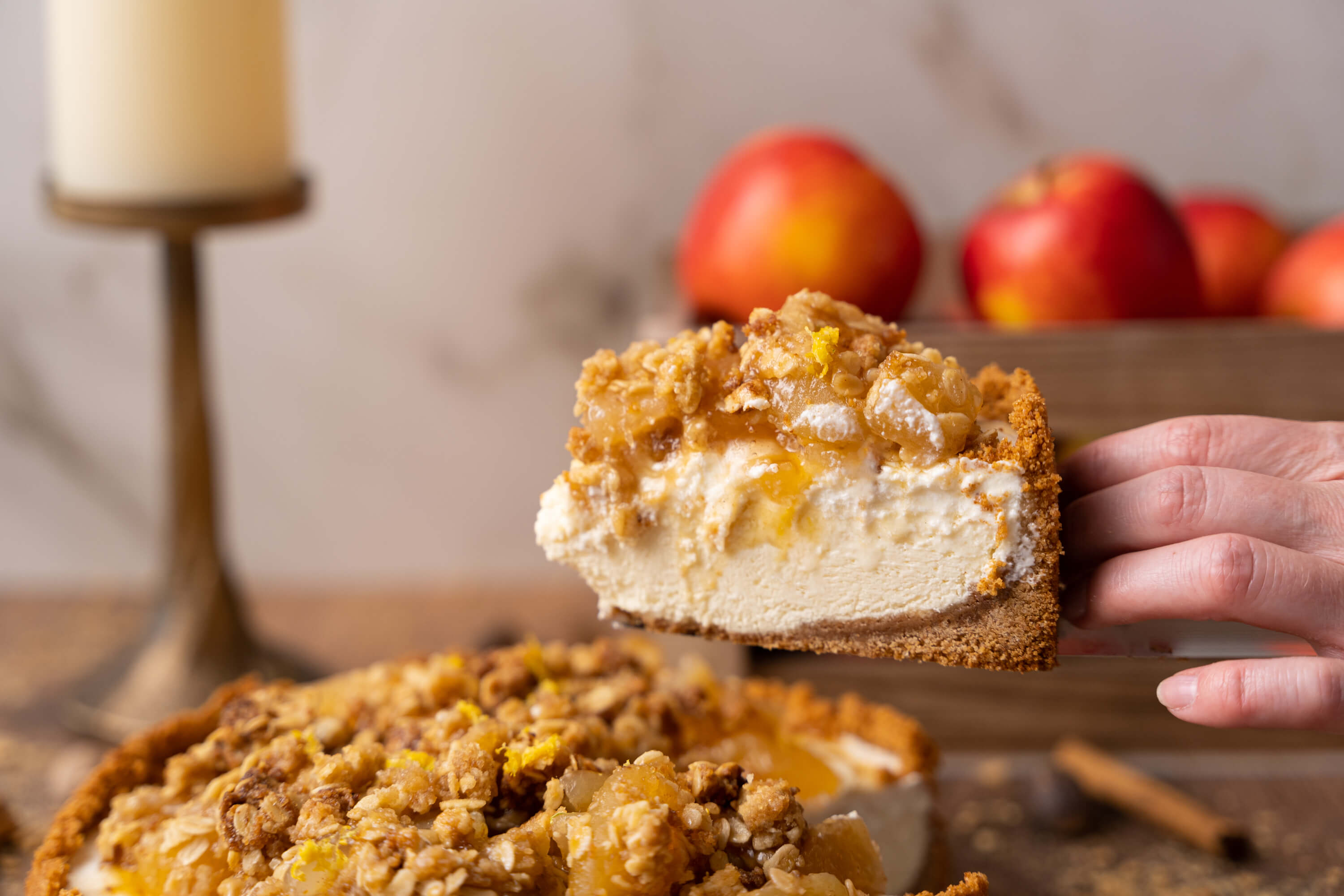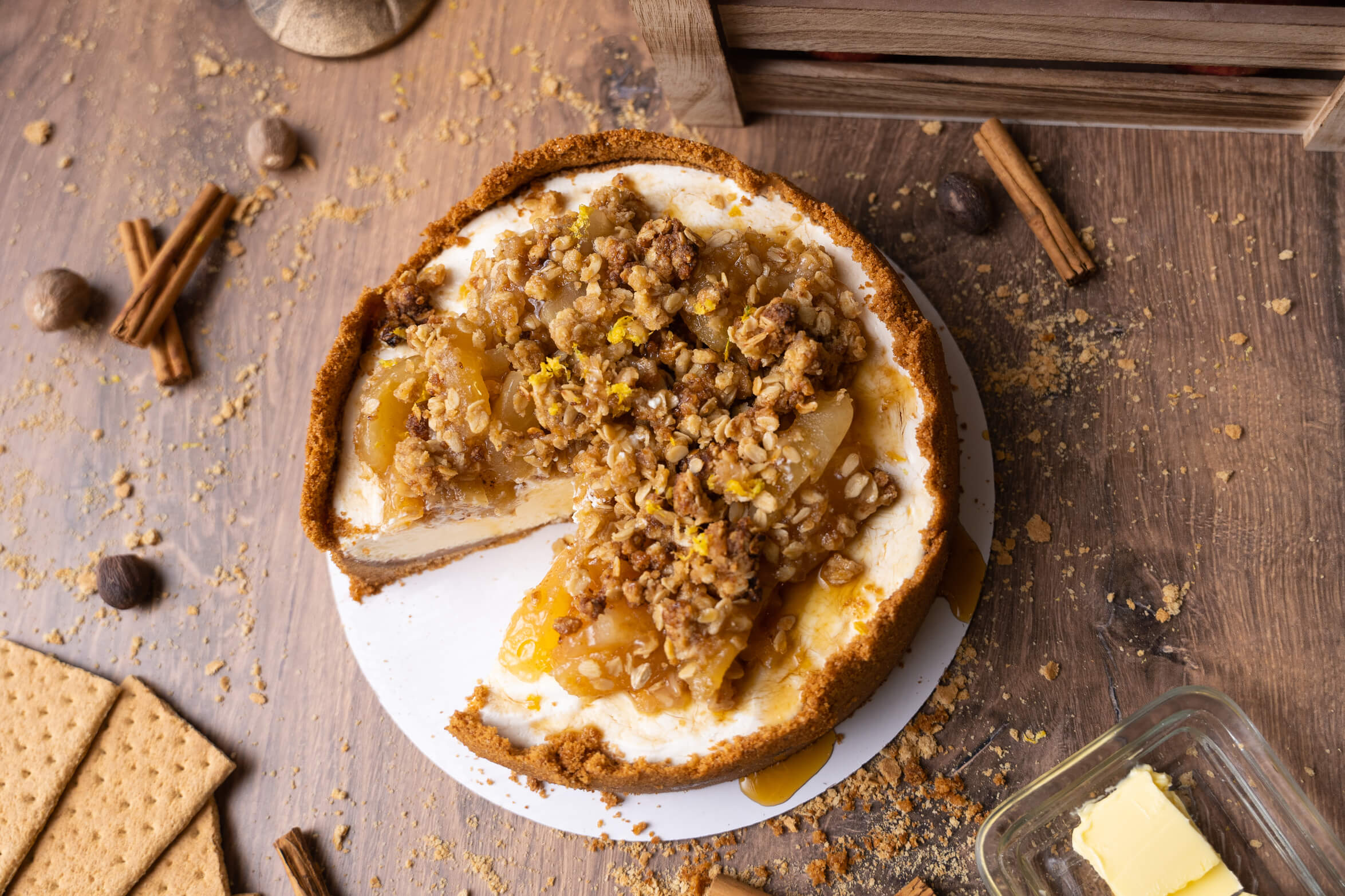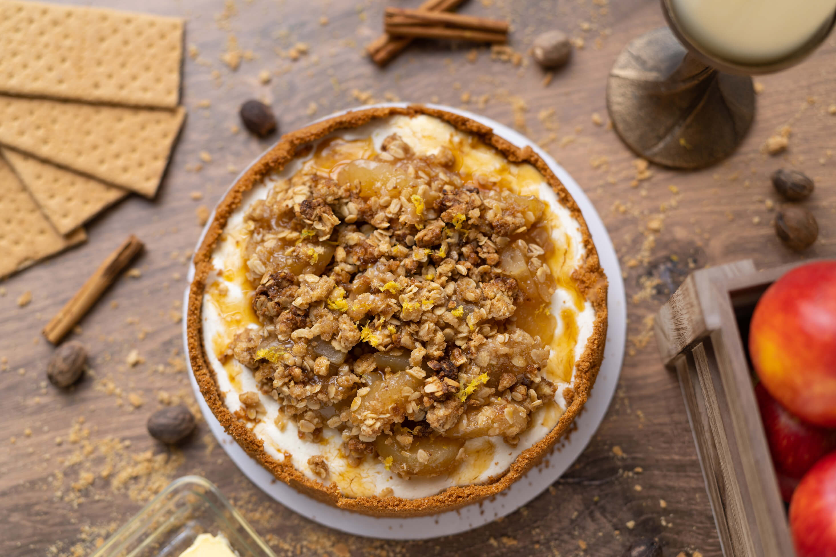 Our signature silky, organic, vanilla-kissed filling is wrapped in a handmade organic graham cracker crust. We then top it with organic apples, organic lemon zest, organic spices, organic Einkorn wheat plus organic sprouted oats to created a streusel that's baked to perfection, and then drizzled with maple syrup for that added pop of fall flavor.