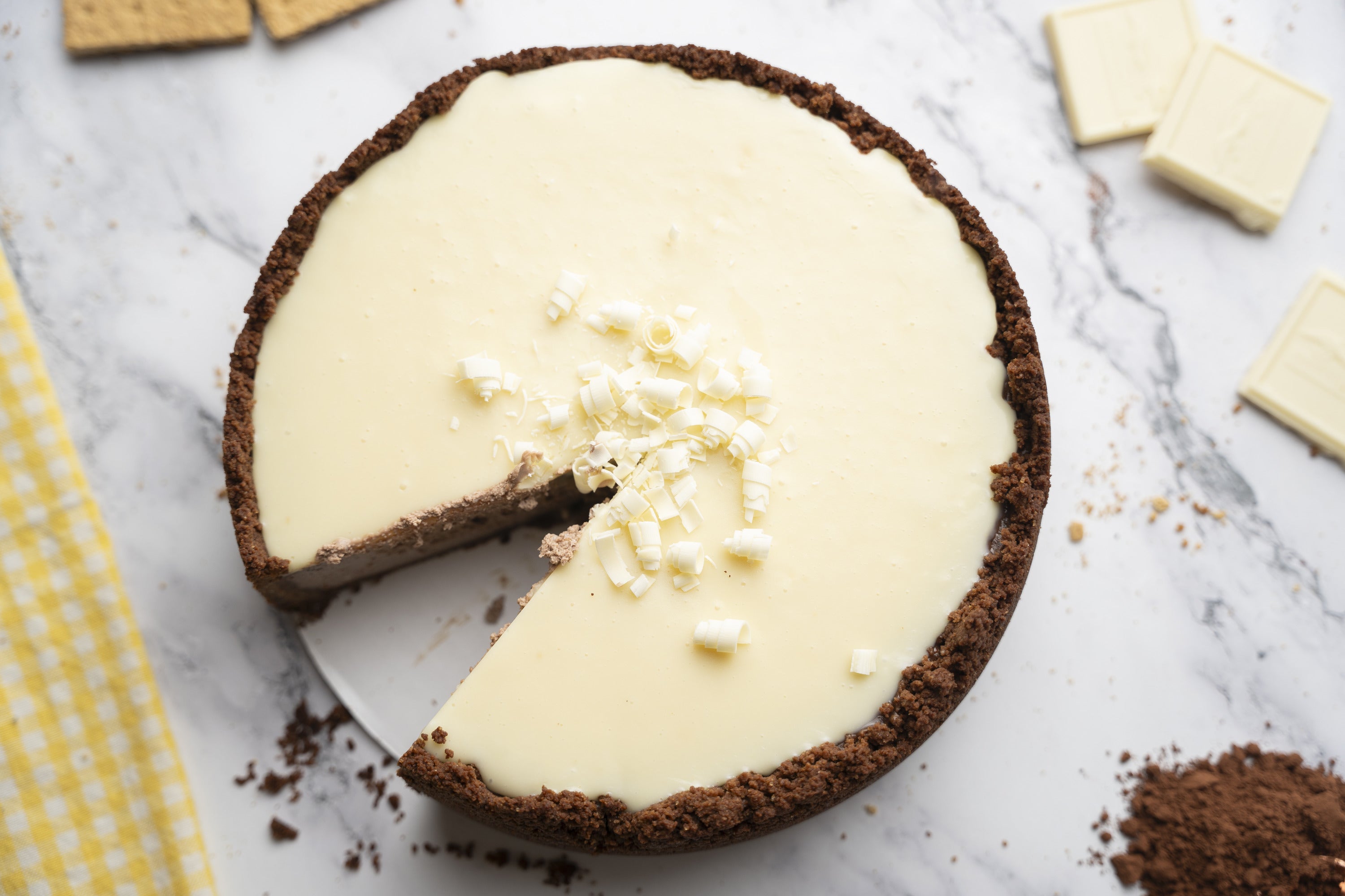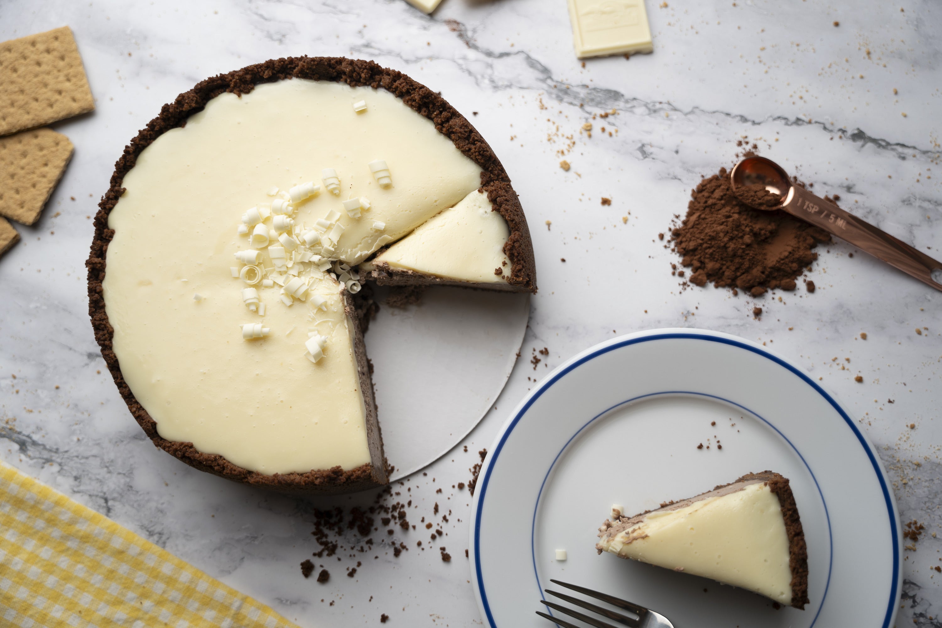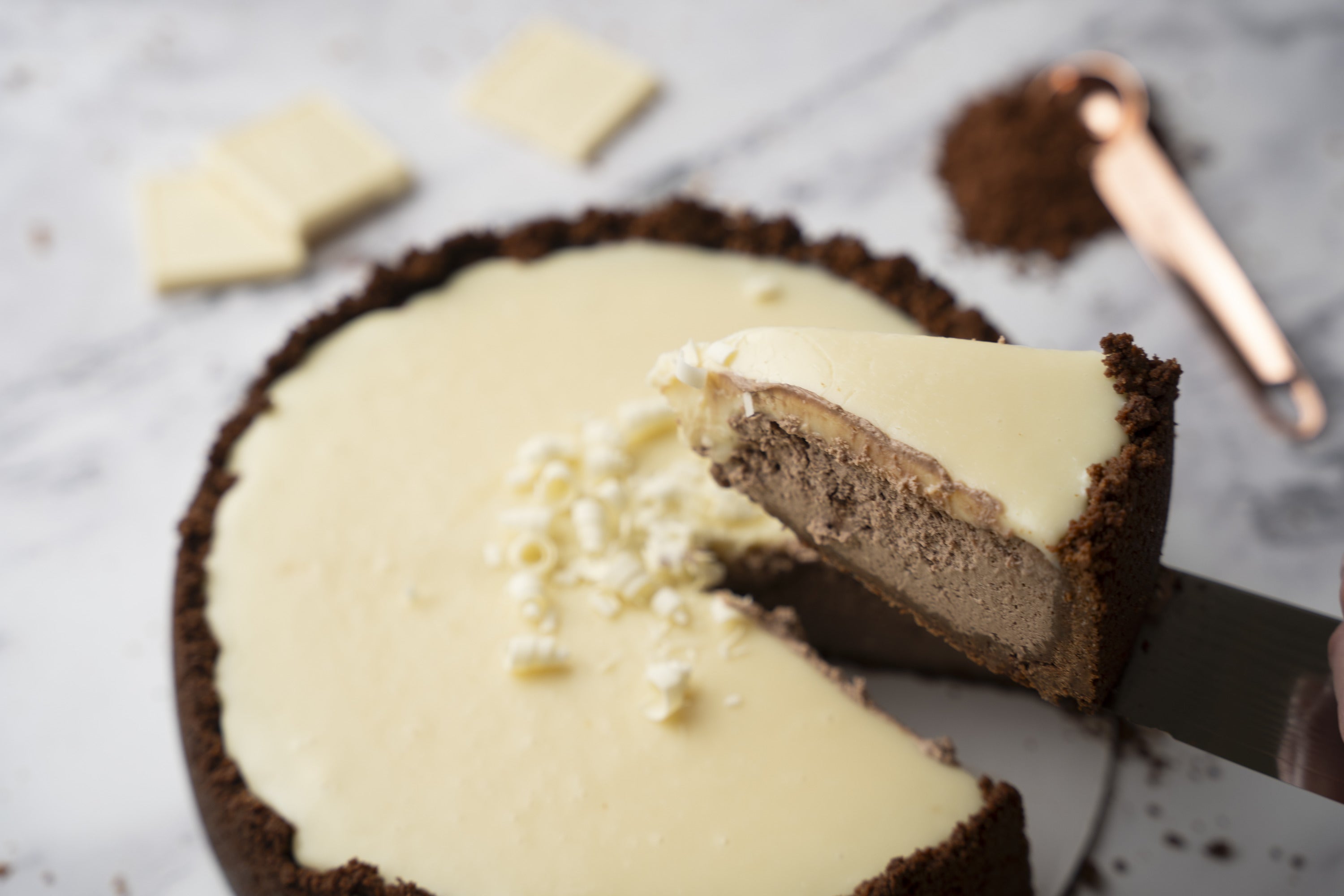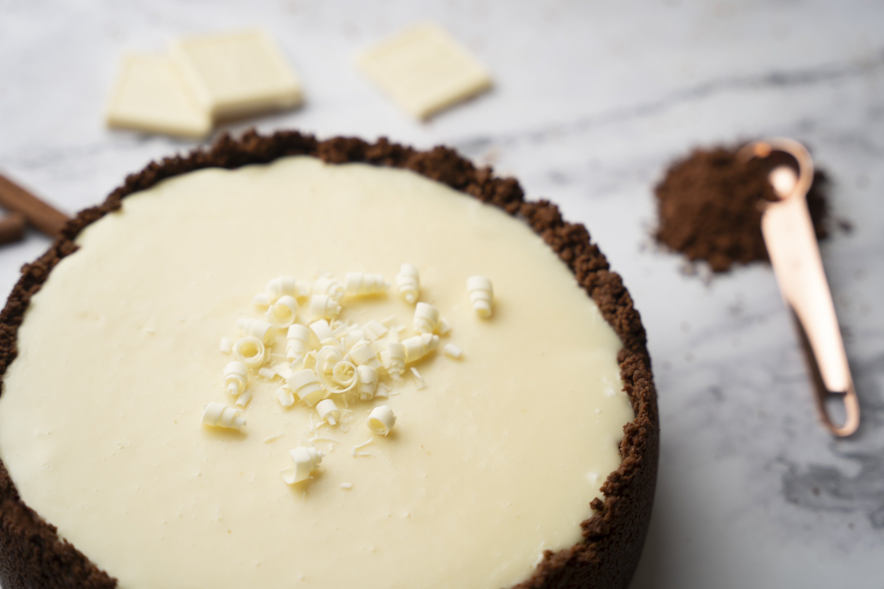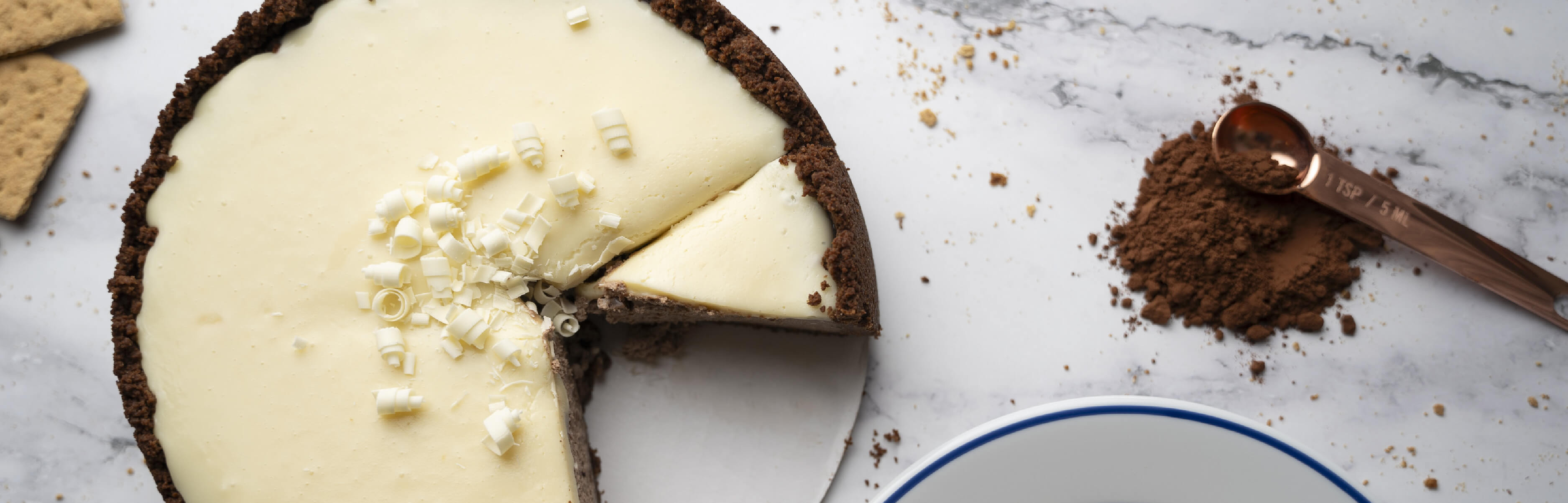 Our signature creamy, organic filling is infused with organic chocolate and sits in a handmade, organic, chocolate graham cracker crust. White chocolate ganache and white chocolate shavings top it off. Lightweight, yet full of perfectly balanced flavor, this cheesecake is the ultimate in chocolate decadence.