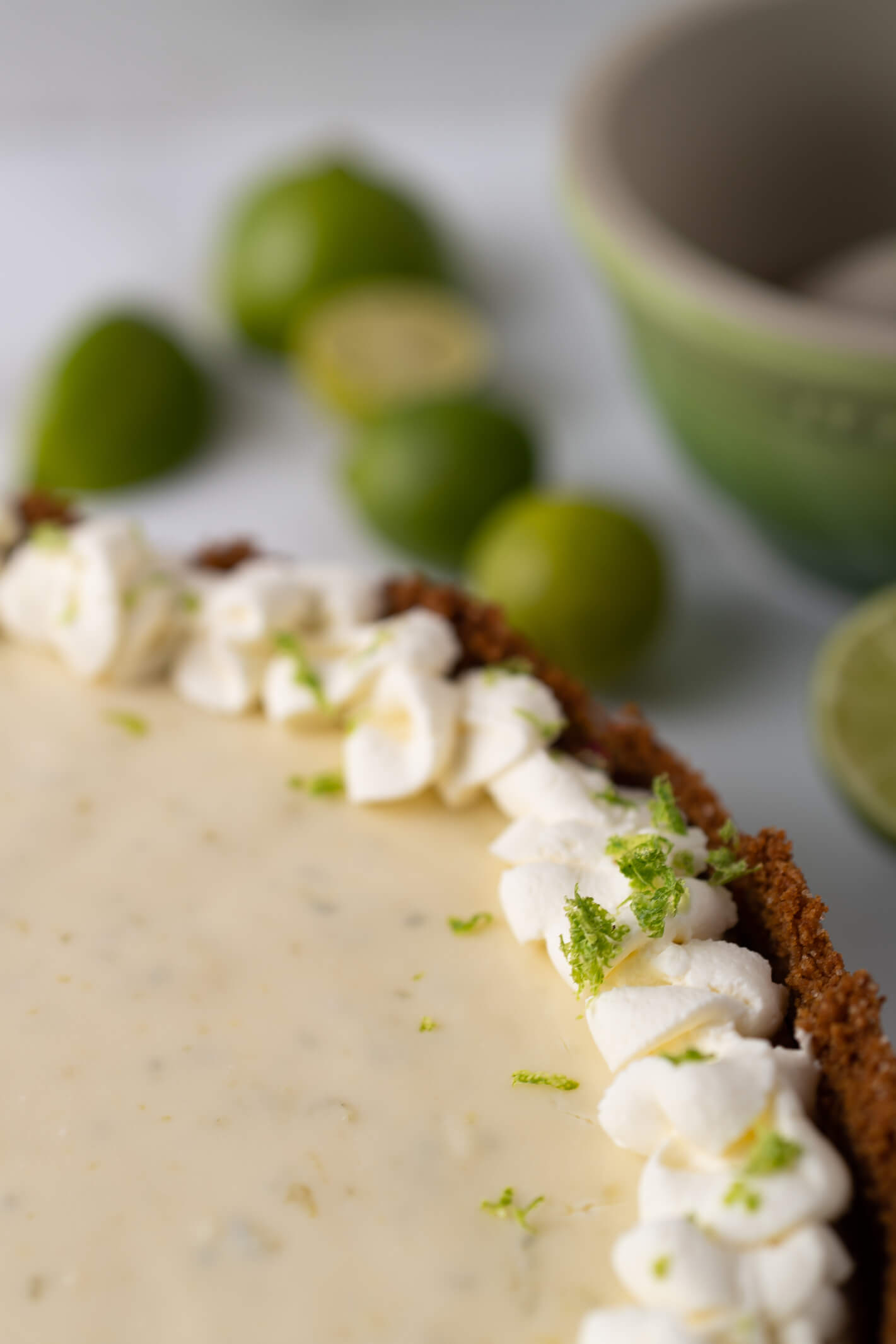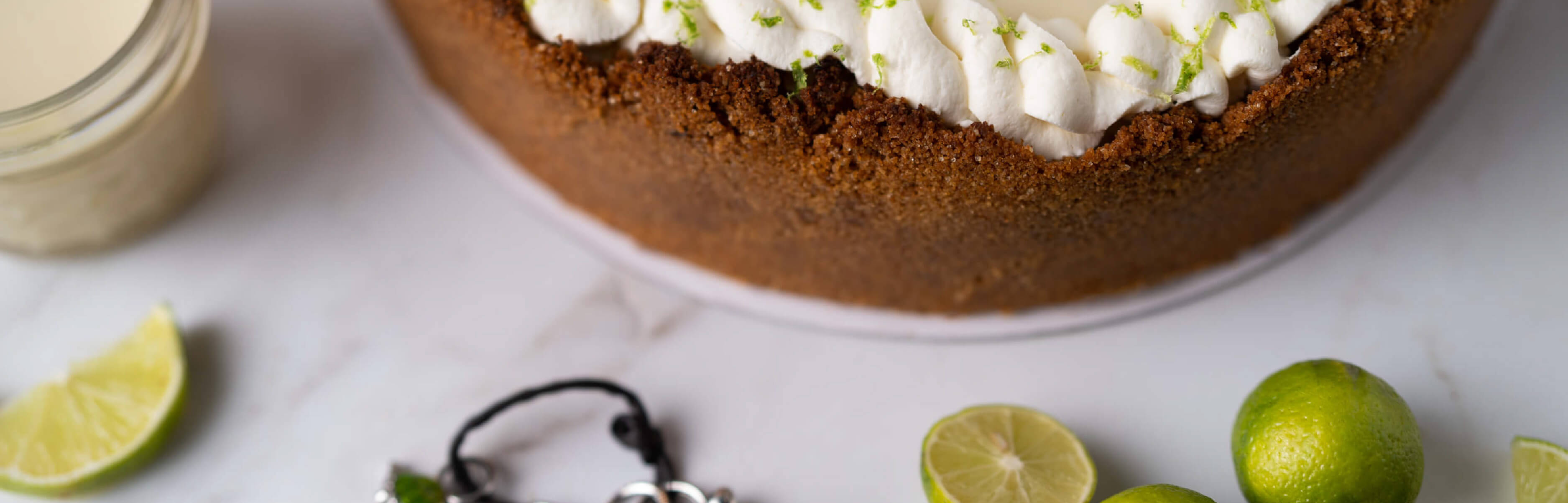 Our signature creamy, organic filling is wrapped in an organic graham cracker cardamom crust and topped with an organic key lime layer loaded with bright lime flavor featuring the perfect balance of sweet and tang. Customers have called it a "game changer," and we think you'll agree! Garnished with fresh whipped cream and lime zest, it’s so good, you’ll want it all year round.