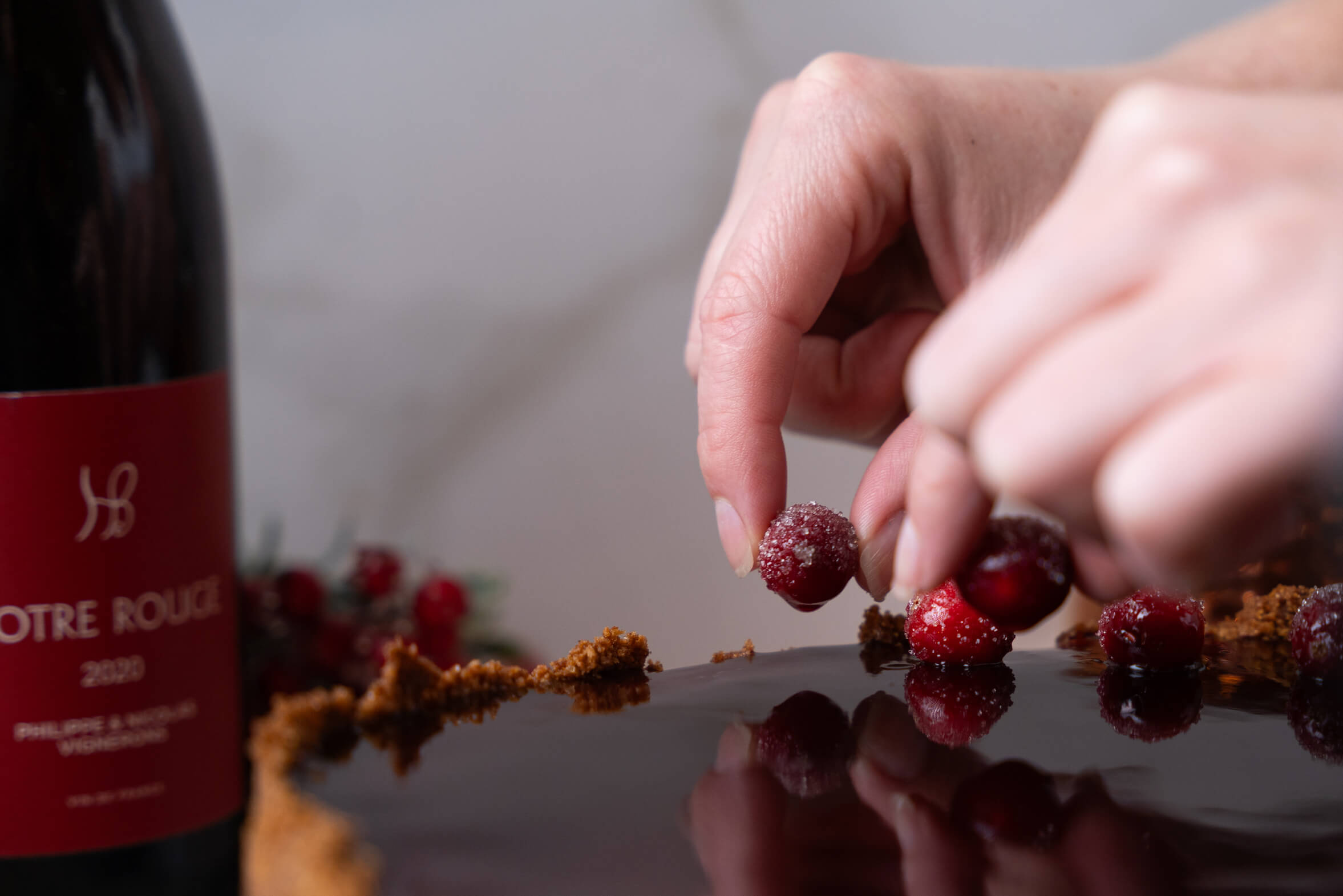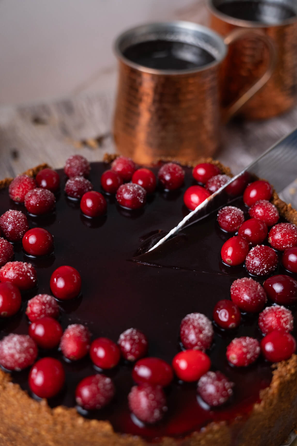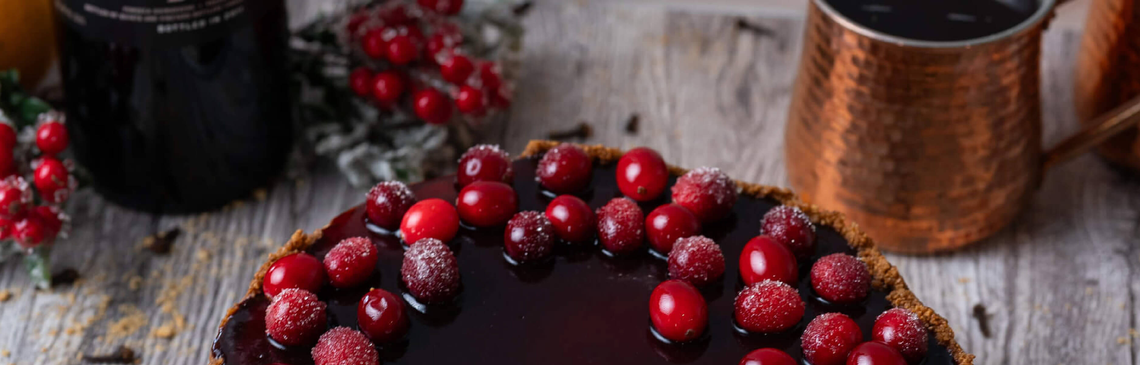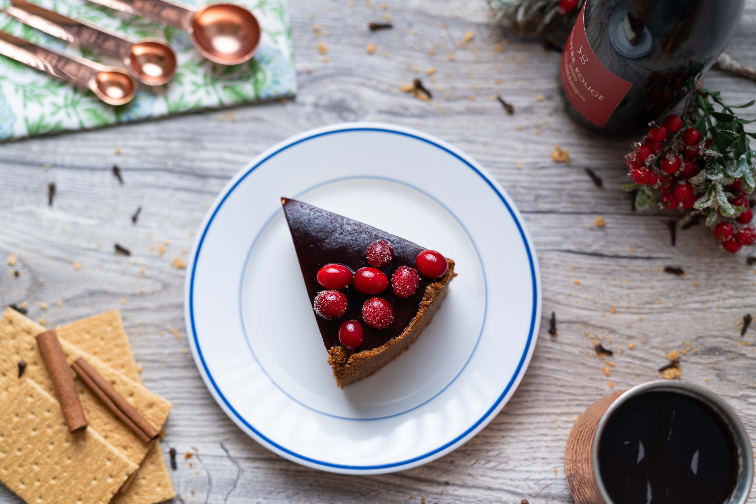 Our signature creamy, vanilla-kissed organic filling sits in a gingerbread cookie crust made from scratch and is then topped with a mulled port-wine reduction sauce and garnished with sugared cranberries. It tastes as stunning as it looks. The warmth of the ginger in the crust, and the soft spice of the subtly sweet mulled wine, blend magnificently with the cool, creamy filling.