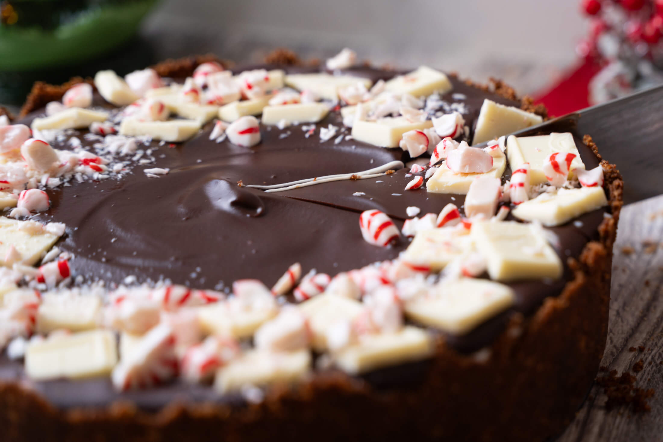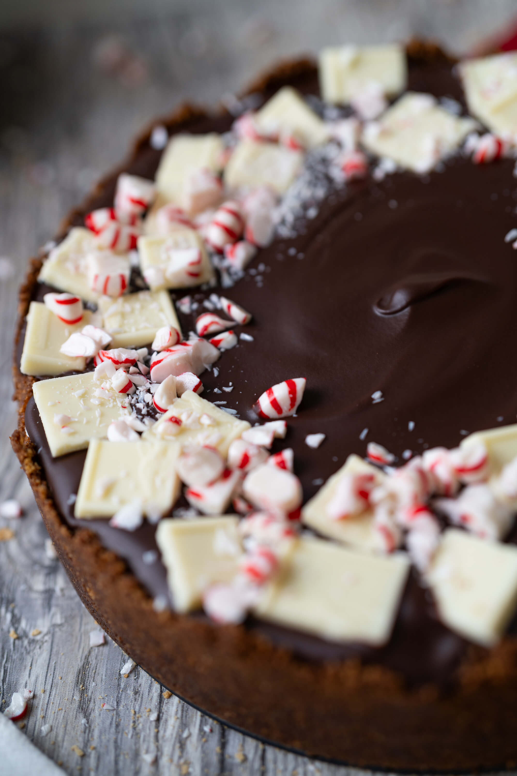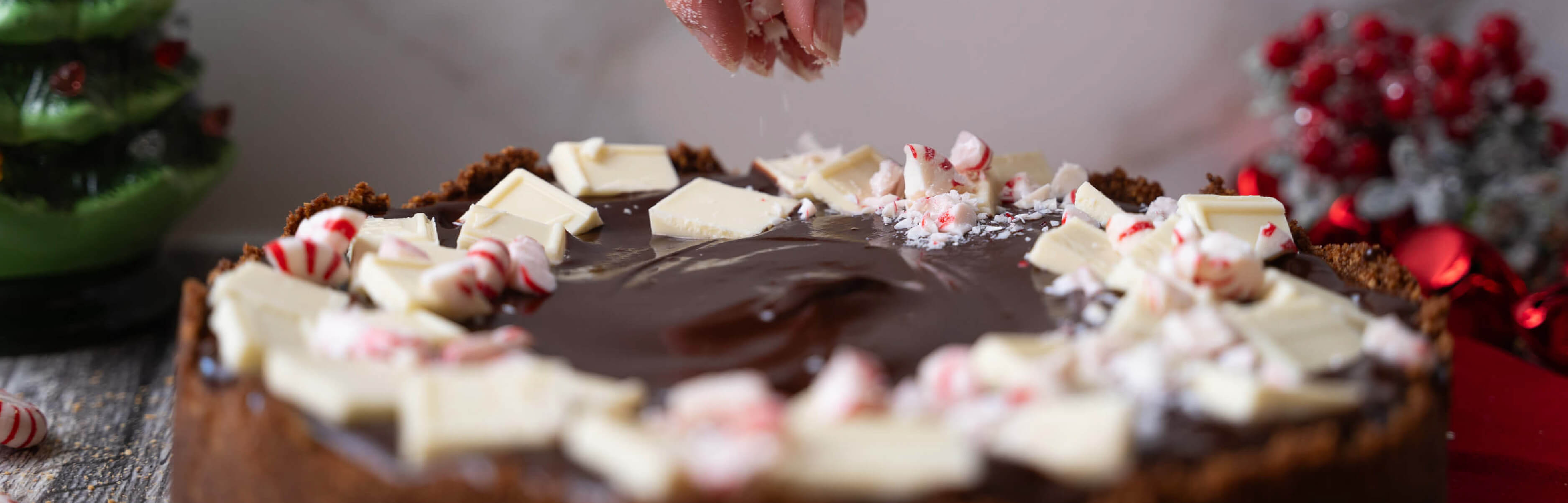 Our signature creamy, vanilla-kissed organic filling is wrapped in an organic chocolate graham cracker crust and topped with a white and dark chocolate peppermint-infused ganache garnished with broken candy cane bits. The creamy filling balances perfectly with the chocolate crust, and the chocolate ganache has just a delicate touch of mint.