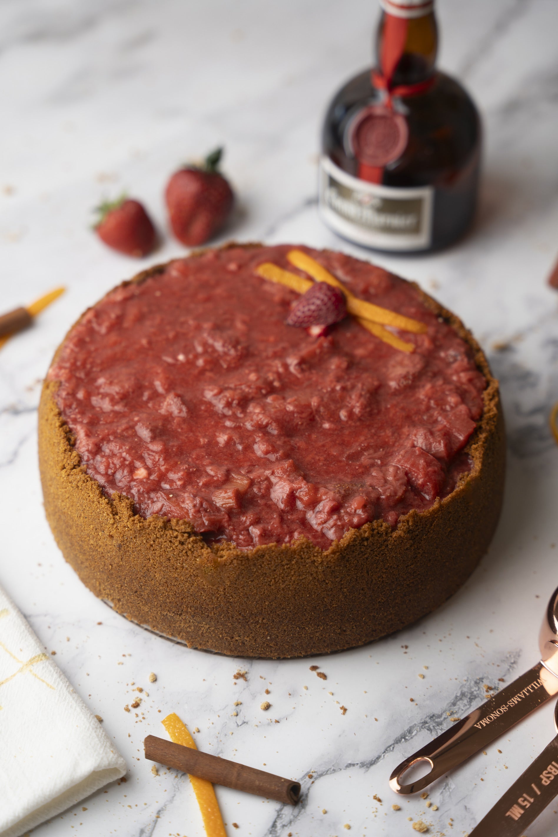 Organic cream cheese (organic pasteurized milk and organic cream, cheese culture, salt, organic locust bean gum), organic sour cream (organic cultured pasteurized nonfat milk, organic pasteurized cream, acidophilus and bifidus cultures, enzyme), organic sugar, organic graham crackers (organic whole grain wheat flour [organic graham flour], organic wheat flour, organic cane sugar, organic expeller-pressed sunflower oil, organic honey, organic molasses, leavening [baking soda, ammonium bicarbonate and cream of tartar], organic vanilla flavor, organic brown sugar flavor, sea salt, organic rosemary extract), organic brown sugar, organic eggs, organic strawberries, organic rhubarb, organic butter, Grand Marnier liquor, organic vanilla extract, organic almond extract, organic spices, cornstarch (non-GMO).
